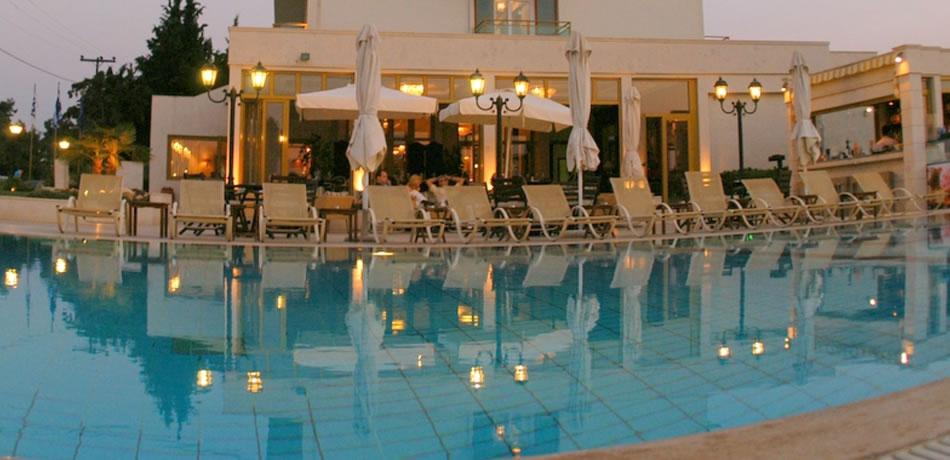 Hotel Santa Beach (ex. Galaxias Beach) se nalazi na samoj plaži oko 700 metara od centar Agia Triade i oko 25 kilometara od Soluna. Hotel ima recepciju, bar, bar pored bazena, otvoreni bazen, restoran, salu za konferencije, bazen, parking. Hotel ima i besplatan pristup Internetu u javnim delovima hotela. Suncobrani i ležaljke oko bazena i na plaži su uključeni u cenu. Sobe imaju terasu, TWC sa fenom, mini bar, A/C, krevetac (na upit, bez doplate), telefon, TV, sef (besplatno). Standardne sobe su veličine cca 15 kvm i namenjene su za 2-3 osobe (2 standardna ležaja ili "francuski ležaj" i sofa). Superior sobe su veličine cca 18-20 kvm, renovirane su 2015. i nalaze se na poslednjem spratu hotela. Namenjene su za 2-4 osobe (2 standardna ležaja ili "francuski ležaj" i sofa). Promo superior sobe nemaju terasu. Usluga u hotelu Santa Beach je polupansion: doručak – “švedski sto” (samoposluživanje), večera – “švedski sto” (samoposluživanje) ili - "meni" (posluživanje), u zavisnosti od broja gostiju u hotelu.