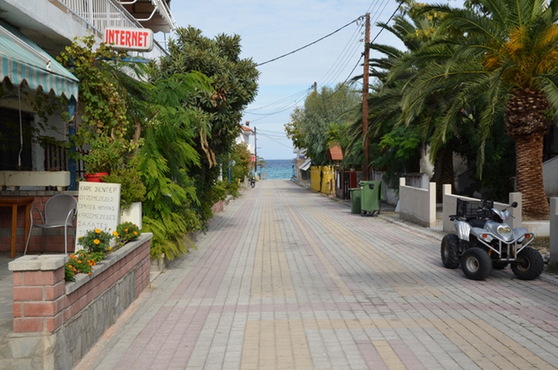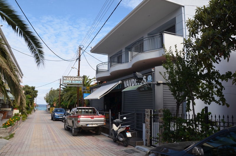Vila Vavdinos se nalazi na idealnom mestu, u strogom centru Polihrona, u pešačkoj zoni u ulici koja se spušta prema moru, udaljena od plaže oko 60 m. U prizemlju objekta se nalazi istoimeni supermarket, dok se u neposrednoj blizini vile nalazi mnoštvo taverni, restorana, pekara,radnje sa suvenirima… Pored je restoran Kapetanios, gde se može organizovati ishrana za goste. Ulicom se izlazi na lepu centralnu gradsku plažu, koja je uglavnom peščana.