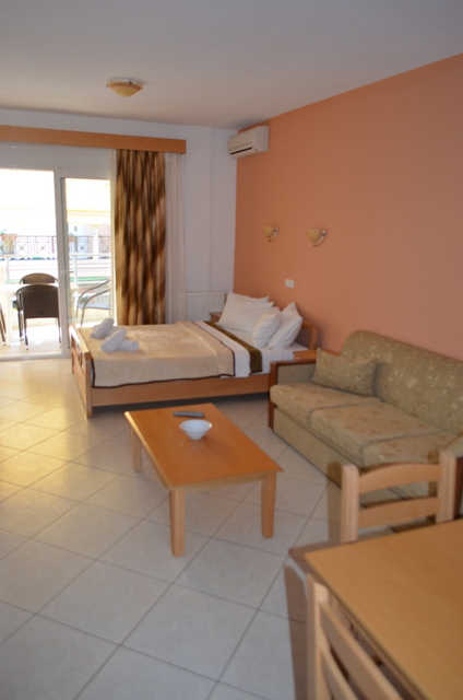 Vila Nikos se nalazi u centralnom delu Potosa na oko 120 metara od mora. Vila poseduje dvokrevetne, trokrevetne i četvorokrevetne studije, četvorokrevetne apartmane kao i studije, sa dva standardna ležaja i kaučem na razvlačenje, za smeštaj četiri osobe i studije, sa četiri standardna ležaja i kaučem na razvlačenje, za smeštaj šest osoba. Sve smeštajne jedinice se nalaze na prvom spratu vile i opremljene su kuhinjom (frižider, mini električan šporet bez rerne, posuđe), klima uređajem čije je korišćenje uračunato u cenu aranžmana, TV prijemnikom, veoma prostranom terasom i Wi Fi signalom. Promena posteljine, peškira i čišćenje studija vrši se svakog petog dana.