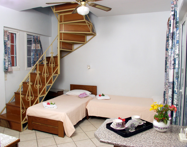 Vila Spiros se nalazi na par minuta hoda od glavne ulice koja predstavlja epicentar svih dešavanja u Laganasu i na 5 minuta hoda do peščane plaže. Vilu okružuje predivan vrt sa bujnom mediteranskom vegetacijom. U ponudi imamo deset apartmana različite strukture: trokrevetne i četvorokrevetne studije, četvorokrevetne i petokrevetne mezonete, kao i petokrevetne i šestokrevetne duplekse. Prostrani trokrevetni i četvorokrevetni studiji nalaze se u visokom prizemlju. Mezoneti se sastoje od dnevne sobe koja se nalazi na prvom spratu i spavaće sobe u potkrovlju, sobe su povezane spiralnim stepeništem i svaka soba poseduje sopstveno kupatilo. Šestokrevetni dupleksi nalaze se u visokom prizemlju, poseduju prostranu dnevnu sobu i dve spavaće sobe. Sve smeštajne jedinice poseduju kompletno opremljenu kuhinju, frižider, mini električni šporet, posuđe, terasu, TV aparat, Wi-Fi (doplata na licu mesta 10 eur za 10 dana), TWC, i klima uređaj čije korišćenje se doplaćuje 6 eura po danu. Iza same vile nalazi se bazen čije korišćenje nije omogućeno.