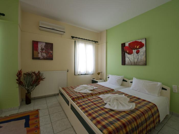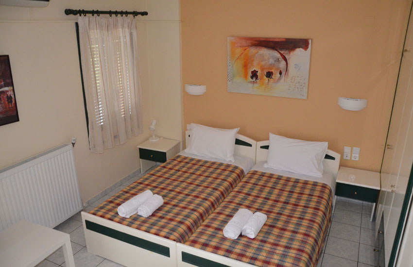 Dvokrevetni studiji su veoma prostrani i sastoje se od dva spojena singl standardna ležaja, noćnog stočića, TV, Klima uredjaja, ormara i lepih sitnih detalja koji ukrašavaju ove lepe studije. Kuhinja je u potpunosti opremljena za dve osobe, i pored standardnog posudja studio poseduje rešo sa tri ringle sa malom rernom, frižider, ketler i mali kafemat za filter kafu. Kupatilo je standardno i ima tuš sa zavesom. Studiji poseduju terasu sa setom od stola i dve stolice gde možete uživati u odmoru i zelenilu, a pogled sa terase je napred na ulicu.