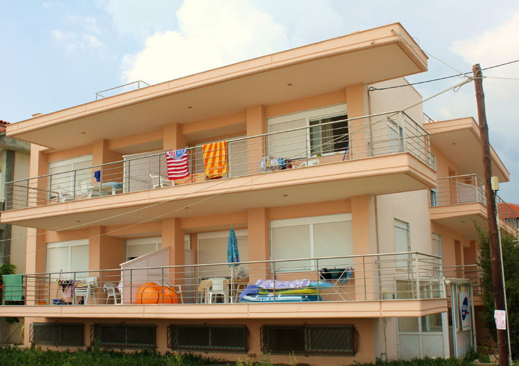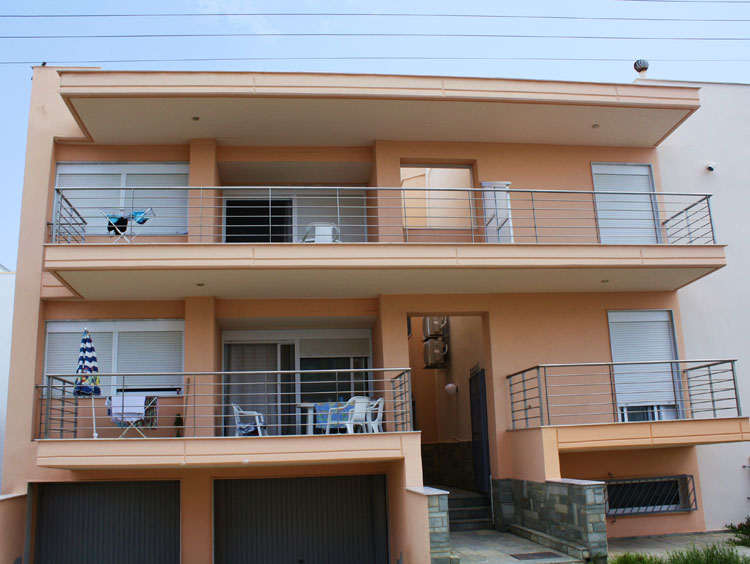 Nalazi se uz plažu u novom delu Sartija, poznata kao kuća sa najprostranijim apartmanima i fantastičnim direktnim ili bočnim pogledom na more. Apartmani se nalaze u visokom prizemlju i na prvom spratu. Svi imaju izuzetno prostrane terase. Svi apartmani imaju TV, signal za bežični internet kao i klima uređaj čije je korišćenje uključeno u cenu u julu i avgustu.